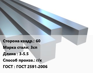 Квадрат стальной 60 Сталь: 3сп L=3-5.5 г/к ГОСТ 2591-2006