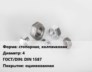 Гайка стопорная, колпачковая D=4 DIN 1587 оцинкованная, упаковка 1000 шт цена от 567 Р / кг, где купить, условия доставки в Витебске и Витебской области