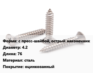 Саморез с пресс-шайбой, острый наконечник D=4.2 L=76 сталь оцинкованный, кг цена от 258.64 Р / кг, где купить, условия доставки в Витебске и Витебской области