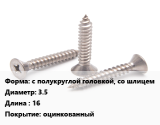 Саморез с полукруглой головкой, со шлицем D=3.5 L=16 оцинкованный, шт цена По запросу где купить, условия доставки в Витебске и Витебской области