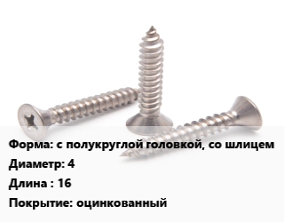 Саморез с полукруглой головкой, со шлицем D=4 L=16 оцинкованный, упаковка 1000 шт цена от 177.3 Р / кг, где купить, условия доставки в Витебске и Витебской области