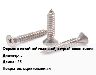 Саморез с потайной головкой, острый наконечник D=3 L=25 оцинкованный
