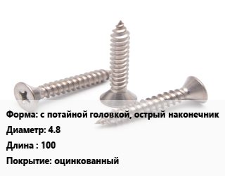 Саморез с потайной головкой, острый наконечник D=4.8 L=100 оцинкованный