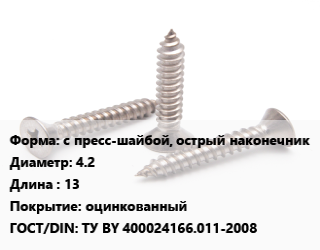 Саморез с пресс-шайбой, острый наконечник D=4.2 L=13 оцинкованный ГОСТ: ТУ BY 400024166.011-2008, упаковка 1000 шт, РМЗ цена от 360.95 Р / кг, где купить, условия доставки в Витебске и Витебской области