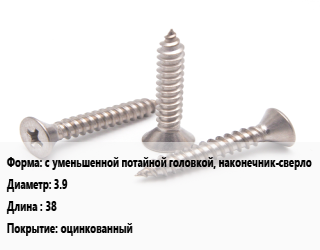 Саморез с уменьшенной потайной головкой, наконечник-сверло D=3.9 L=38 оцинкованный