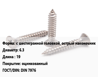 Саморез с шестигранной головкой, острый наконечник D=6.3 L=19 оцинкованный ГОСТ: DIN 7976