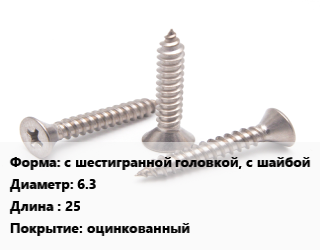 Саморез с шестигранной головкой, с шайбой D=6.3 L=25 оцинкованный