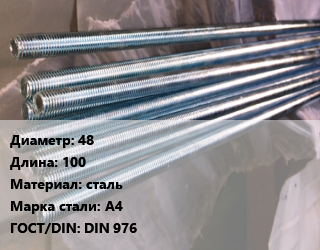 Шпилька стальная 48 L=100 сталь Сталь: А4 ГОСТ: DIN 976, шпилька, шт, по запросу цена от 4 904 Р / шт, где купить, условия доставки в Витебске и Витебской области