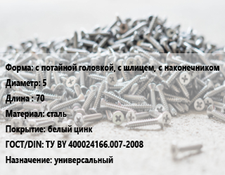Шуруп с потайной головкой, с шлицем, с наконечником 5х70 сталь белый цинк ГОСТ: ТУ BY 400024166.007-2008 универсальный