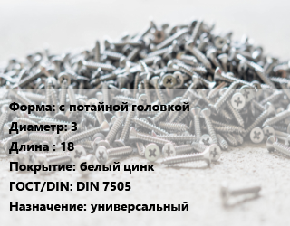 Шуруп с потайной головкой 3х18 белый цинк ГОСТ: DIN 7505 универсальный