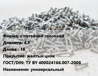 Шуруп с потайной головкой 4.5х16 желтый цинк ГОСТ: ТУ BY 400024166.007-2008 универсальный, упаковка 1000 шт, РечМЗ цена от 375.48 Р / кг, где купить, условия доставки в Витебске и Витебской области