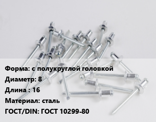 Заклепка с полукруглой головкой 8х16 сталь ГОСТ: ГОСТ 10299-80
