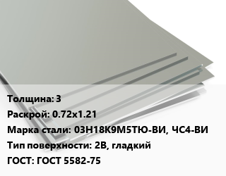 Лист нержавеющий 3 0.72х1.21 Сталь: 03Н18К9М5ТЮ-ВИ, ЧС4-ВИ Тип:2B, гладкий ГОСТ 5582-75