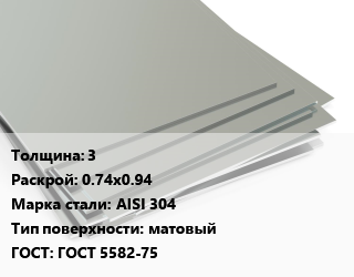 Лист нержавеющий 3 0.74х0.94 Сталь: AISI 304 Тип:матовый ГОСТ 5582-75