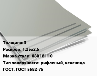 Лист нержавеющий 3 1.25х2.5 Сталь: 08Х18Н10 Тип:рифленый, чечевица ГОСТ 5582-75
