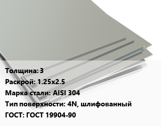 Лист нержавеющий 3 1.25х2.5 Сталь: AISI 304 Тип:4N, шлифованный ГОСТ 19904-90
