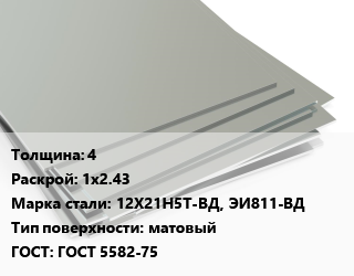 Лист нержавеющий 4 1х2.43 Сталь: 12Х21Н5Т-ВД, ЭИ811-ВД Тип:матовый ГОСТ 5582-75