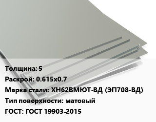 Лист нержавеющий 5 0.615х0.7 Сталь: ХН62ВМЮТ-ВД (ЭП708-ВД) Тип:матовый ГОСТ 19903-2015