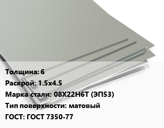 Лист нержавеющий 6 1.5х4.5 Сталь: 08Х22Н6Т (ЭП53) Тип:матовый ГОСТ 7350-77