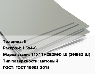 Лист нержавеющий 6 1.5х4-6 Сталь: 11Х11Н2В2МФ-Ш (ЭИ962-Ш) Тип:матовый ГОСТ 19903-2015