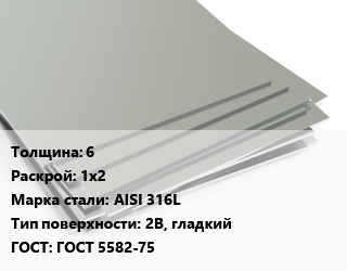 Лист нержавеющий 6 1х2 Сталь: AISI 316L Тип:2B, гладкий ГОСТ 5582-75, шт цена от 42 186 Р / т, где купить, условия доставки в Витебске и Витебской области
