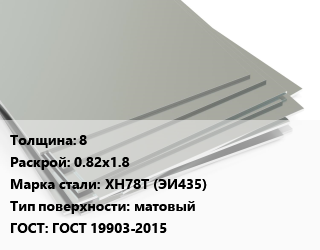 Лист нержавеющий 8 0.82х1.8 Сталь: ХН78Т (ЭИ435) Тип:матовый ГОСТ 19903-2015