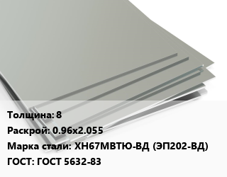 Лист нержавеющий 8 0.96х2.055 Сталь: ХН67МВТЮ-ВД (ЭП202-ВД) ГОСТ 5632-83 цена от 473 675 Р / т, где купить, условия доставки в Витебске и Витебской области