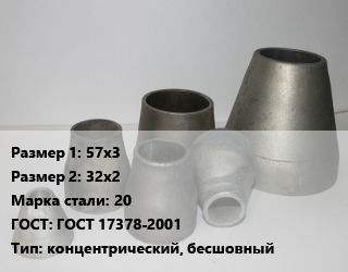 Переход стальной 57х3х32х2 Марка: 20 ГОСТ: ГОСТ 17378-2001 концентрический, бесшовный, шт, приварной, по запросу цена от 65.88 Р / шт, где купить, условия доставки в Витебске и Витебской области